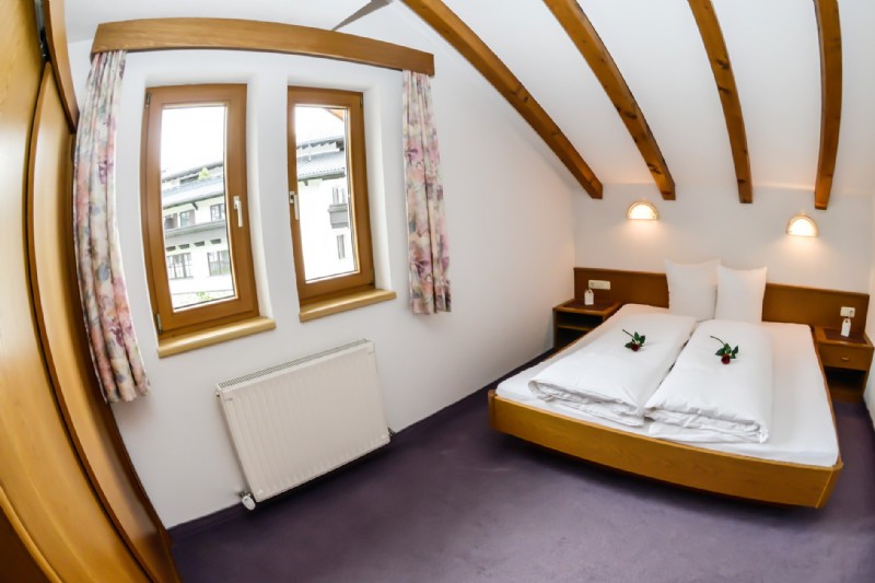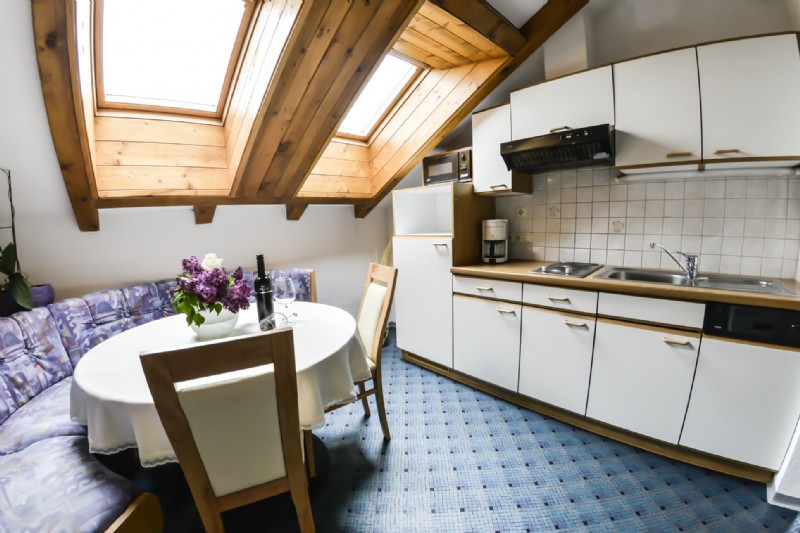 Diese Ferienwohnung überzeugt mit ihren großzügigen Raumverhältnissen (70 m²) und den zwei getrennten Schlafzimmern. Gemütlichkeit verspricht unter anderem die Dachschräge. Dank getrenntem Wohnzimmer, separater Wohnküche sowie Dusche und WC wird die Privatsphäre unserer Gäste gewahrt. Ausgestattet ist unsere Dach-Ferienwohnung mit Geschirr, 2-Plattenherd, Kühlschrank inklusive Tiefkühlfach, Geschirrspülmaschine, Kaffeemaschine, Mikrowelle, Kabel-TV, Radio sowie Safe.